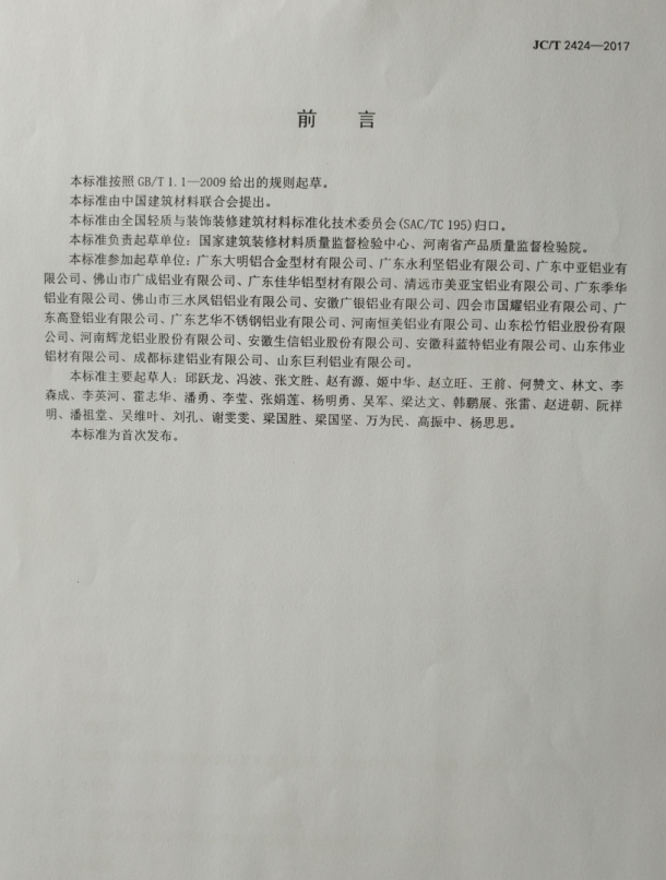 恭喜山東巨利鋁業(yè)有限公司成為建材行業(yè)標(biāo)準(zhǔn) JC/T 2424-2017 起草制定單位